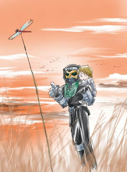 ぐずる侑斗をおんぶして散歩に出るデネブ。