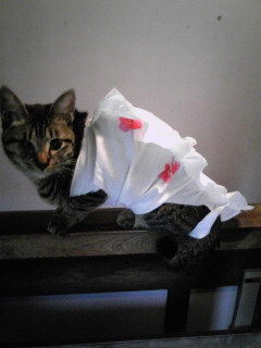 いらない手ぬぐいに4つ穴を開けて、猫を通して背中でかんたんに縫い止めます。